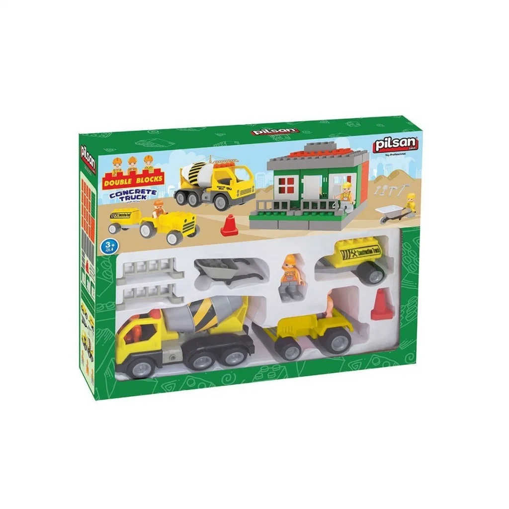 İçerisinde 3 oyuncak figür, 1 beton aracı, 1 traktör ve römorku ile el arabası birlikte toplam 49 parçadan oluşmaktadır.