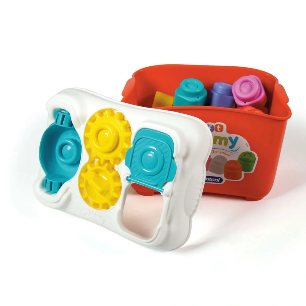 Küçük çocuklar için tasarlanmış 15 Clemmy yapım parçası ve çok sayıda mekanik aktiviteye sahip eğlenceli bir kapağı olan süper renkli bir kova!