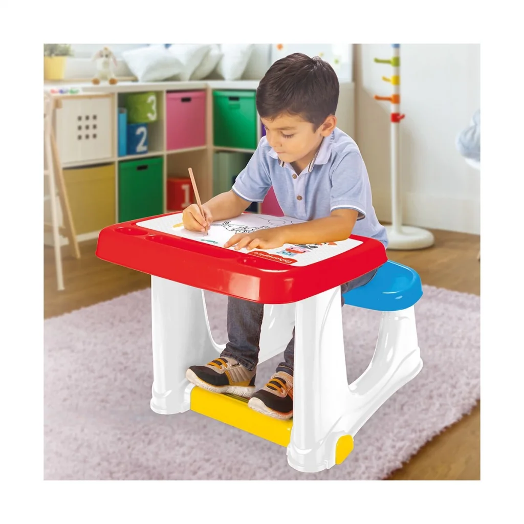 -24 ay ve üzeri çocuklar için uygundur. -49x70x54 cm. ölçülerindedir. -Çalışma masasının üzerinde kalemlik v.b. koyma yerleri yer almaktadır. -Ergonomik ayak dinlenme yeri vardır. -Oturak kısmı konforludur. -Kutu içerisindedir. -Kolay kurulumu vardır.