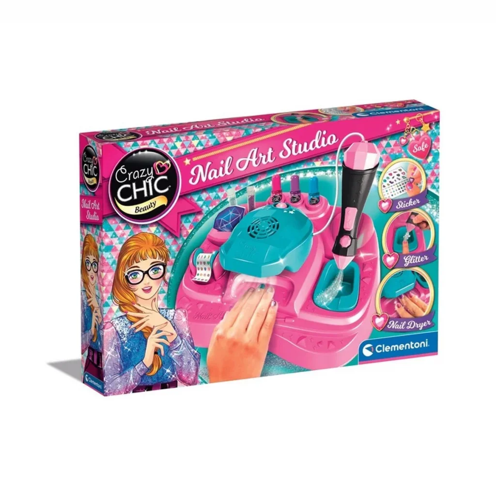 Sim püskürtücü ve oje kurutma makinesi kesinlikle son modaya uygun bir görünüm garanti ediyor. Set, harika parıltılı süslemeler için Crazy Chic ojeler, tırnak için çıkartmalar ve renkli simler içerir!
