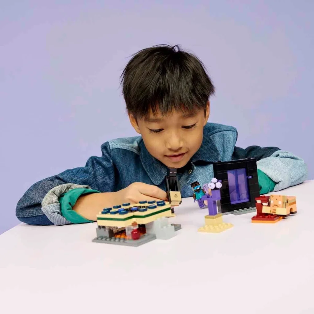 7 yaş ve üzeri erkek ve kız çocuklar için Nether ve End Geçidi Yolculuğu (21584) video oyunu oyuncağı ile Minecraft karakterlerini, uygulamalı bir video oyunu macerasına taşıyın. Geçitlerden geçerek her biyomdan bir modeli keşfedin ve havalı bir kahraman mini figürü, artı olarak Enderman ve yavru hoglin figürleriyle maceralara atılın! Bu LEGO Minecraft oyun setinde, her biyomda küçük modellere erişim sağlayan fonksiyonlara sahip bir End geçidi ve bir Nether geçidi bulunur.