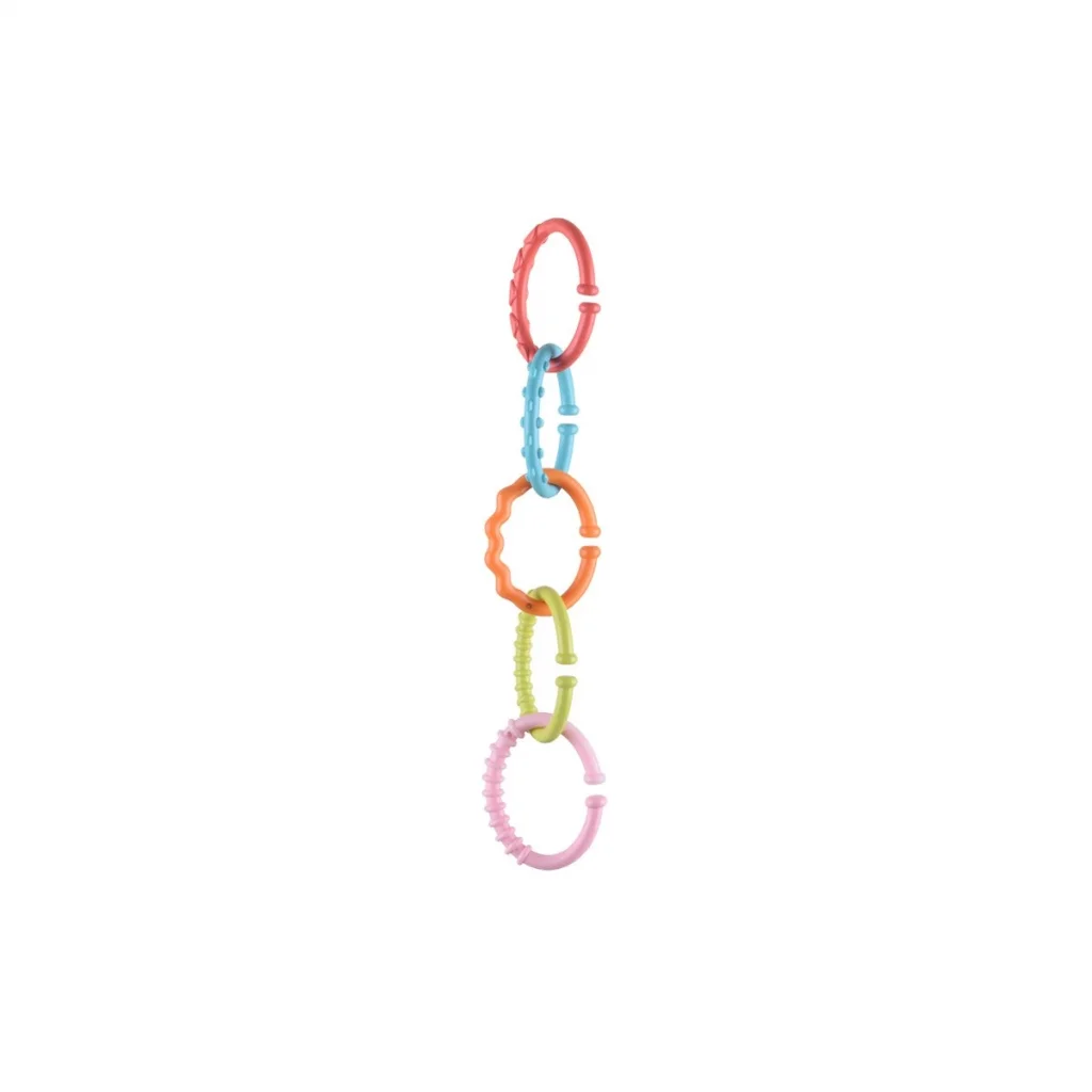 Halkaların üzerindeki şekiller görme ve dokunma duyularını geliştirir. Renkli zincirler bebek arabasına, beşiğe ve oto koltuğuna kolayca asılabilir. Minik eller için özel tasarlanmış kolayca kavranabilen Renkli Zincirler ile oynamak ve diş kaşımak için idealdir. 4 ay ve üzeri bebekler için uygundur. Ürün ölçüsü: 14x4,5x20cm