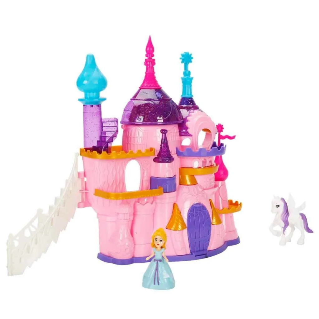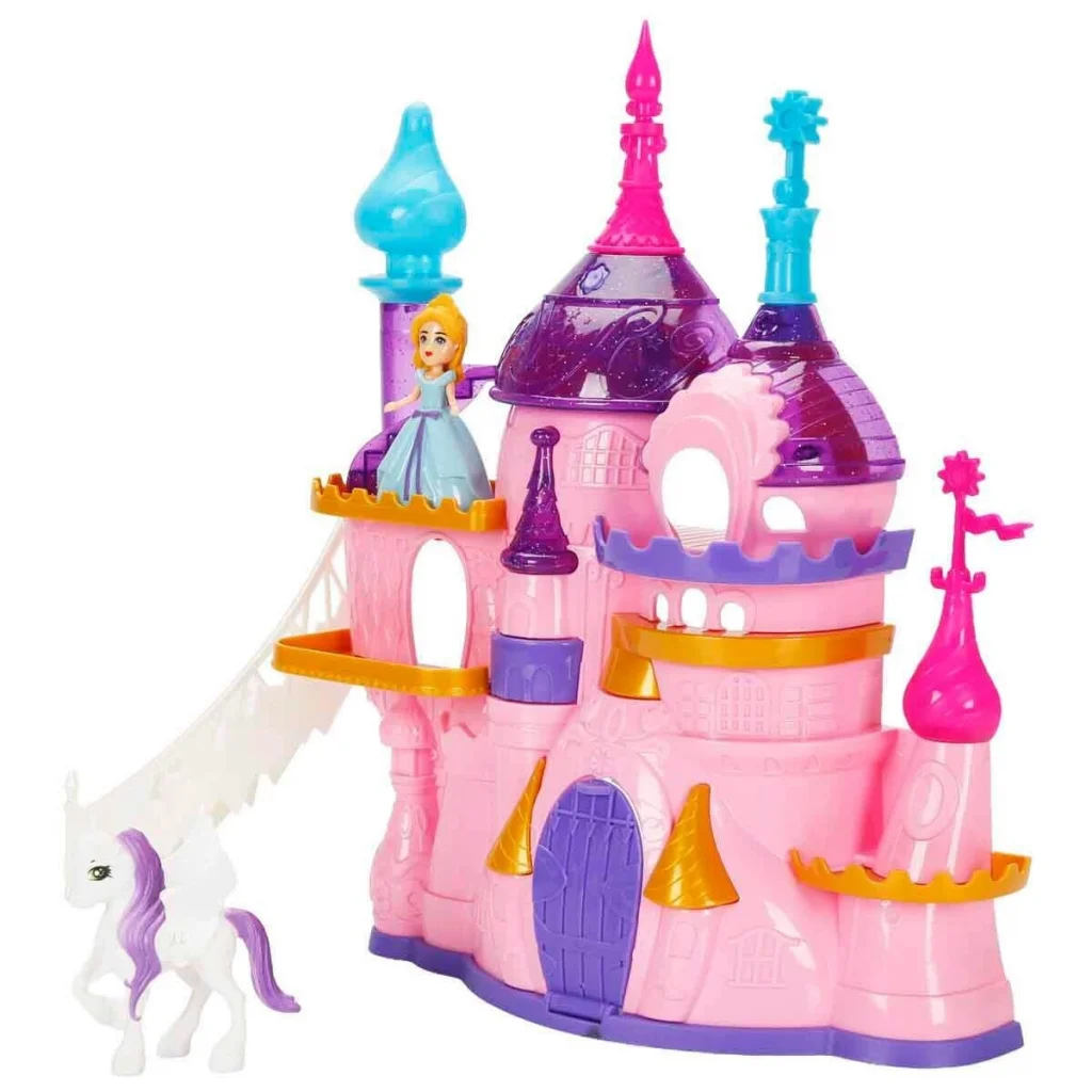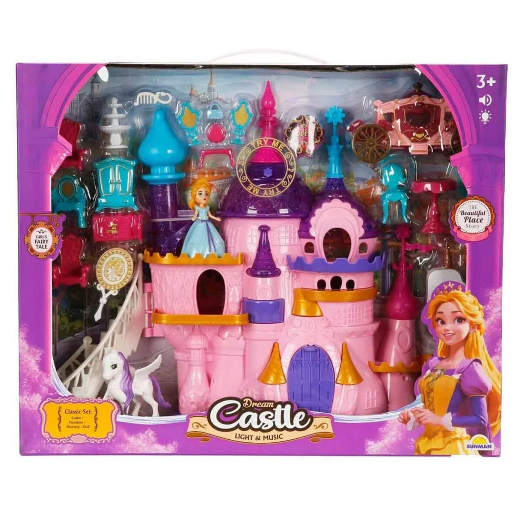 Bir varmış bir yokmuş… Pembe kuleleri gökyüzüne uzanan, ışıkları parıldayan büyülü bir şato varmış. Bu şatonun içinde seni birbirinden güzel detaylar beklermiş… Zarif beyaz piyano başında tatlı melodilere eşlik eder gibi yapabilir, güzellik masasındaki ayna ve tarakla prenses bebeğini büyük baloya hazırlayabilirmişsin. Yatağında dinlendirebilir, koltuklarda hayaller kurabilir, masa ve sandalyelerde şatoya yakışır şekilde hazırlayabilirmişsin.