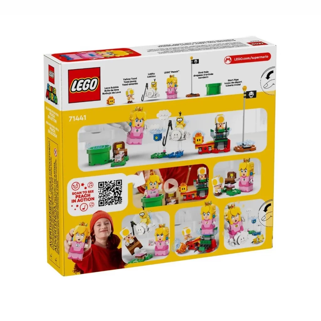 - 4 LEGO® Super Mario™ figürü – Bu Nintendo® LEGO setinde interaktif bir LEGO® Peach™ prenses figürü, ayrıca Lakitu, Yellow Toad ve Lava Bubble bulunur