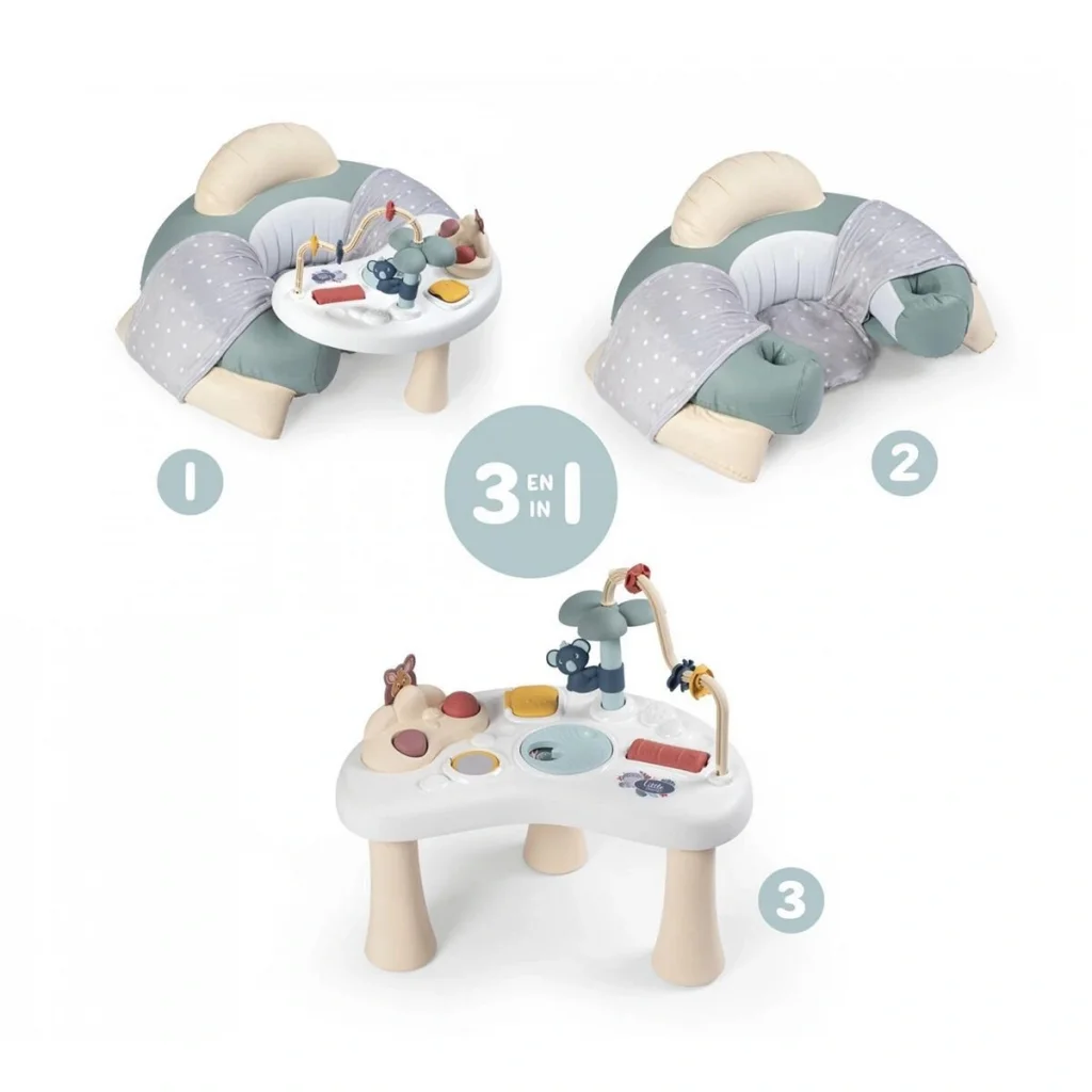 Little Smoby’den Cozy aktivite masalı bebek koltuğu sırt ve kolçaklı, rahat, şişirilebilir yuvarlak bir bebek koltuğudur.