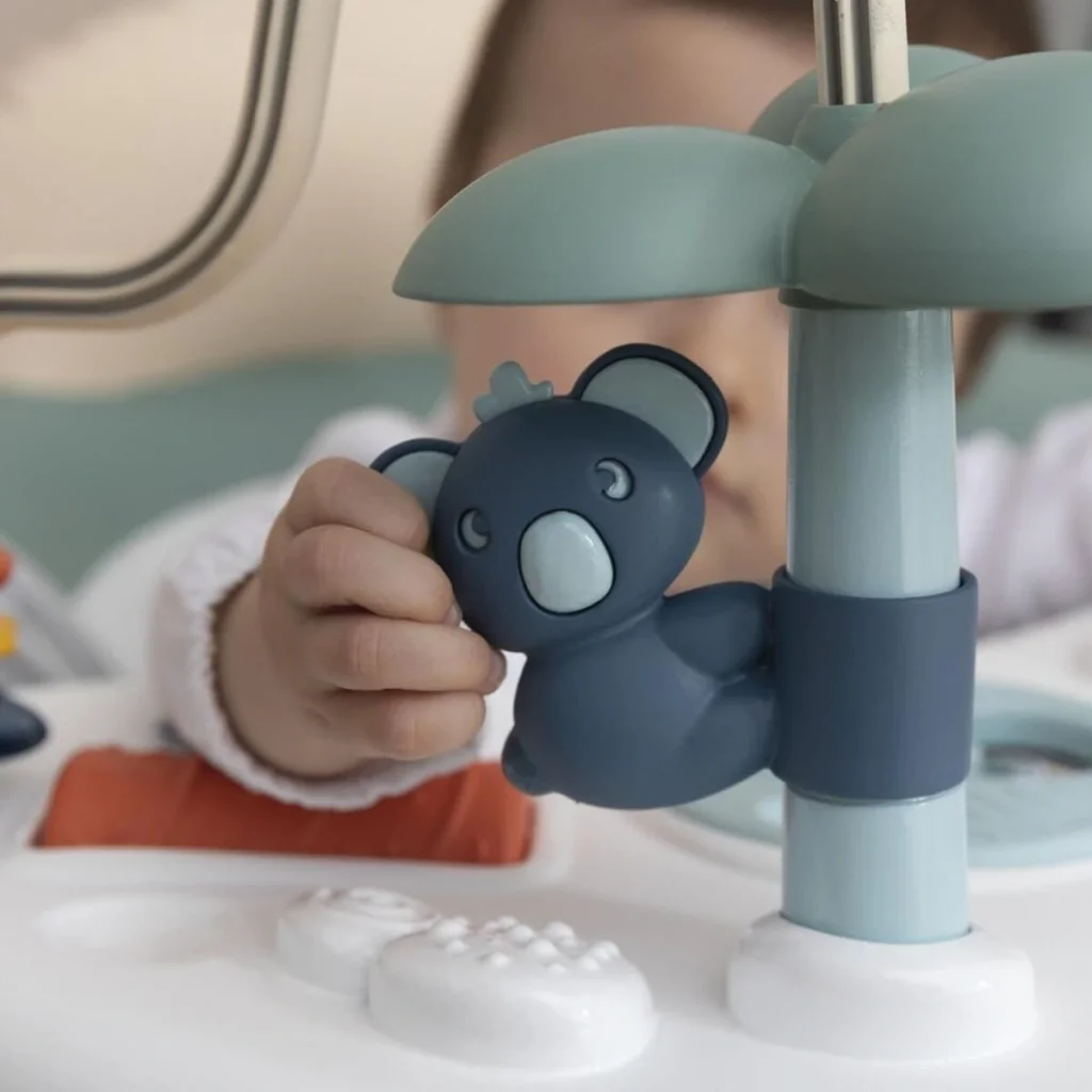 Plastik aktivite masası çok sayıda oyun seçeneği sunar: sevimli bir kanguru ve bebeği ile bir saklambaç oyunu, ağaçta bir koala ayısı, bir motor becerileri döngüsü, dönen bir oyun silindiri ve küçük bir ayna.