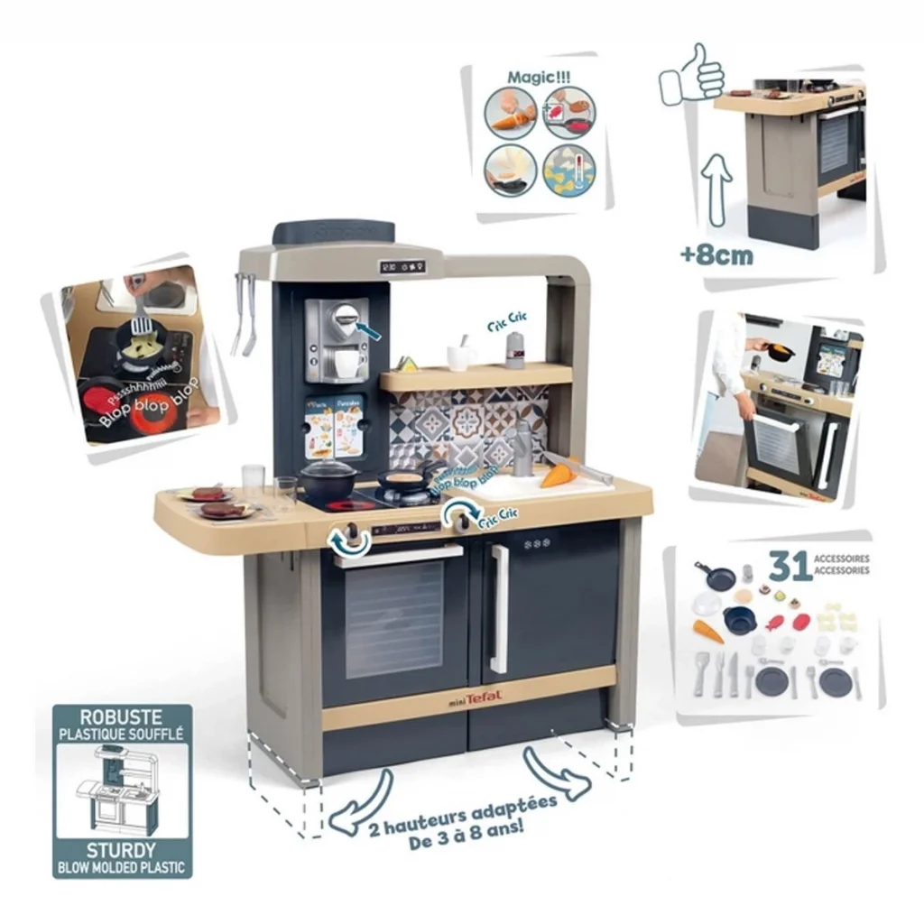 Yüksekliği ayarlanabilen tezgah sayesinde tasarım mutfağı çocuğun boyuna göre kolaylıkla uyarlanabiliyor. Bunun için iki ön panel ayakların üzerine yerleştirilir ve tezgah 50 cm'den 58 cm'ye çıkar. Ayrıca son derece sağlam oyun mutfağı, çıkarılabilir ızgaralı bir fırın, raflı bir buzdolabı, 2 ocaklı bir ocak ve ocak gözlerinden birinde elektronik ses modülü, bir lavabo ve entegre espresso makinesine sahip bir aspiratör ile donatılmıştır. Ayrıca "tık" sesi çıkaran tuzluk ve biberlikler, krepi havada çevirmeyi kolaylaştıran sihirli krep tavası, tabaklar ve çatal bıçak takımları ve çeşitli oyun yemeği paketleri gibi çok sayıda ayrıntılı aksesuar.