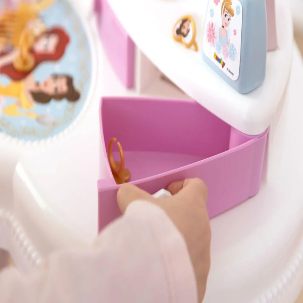 Smoby'den şimdi de Disney Princess 2'si 1 arada güzellik masası, tabureli (maks. 50 kg). 3 çekmeceli ve 1 döner ayna.