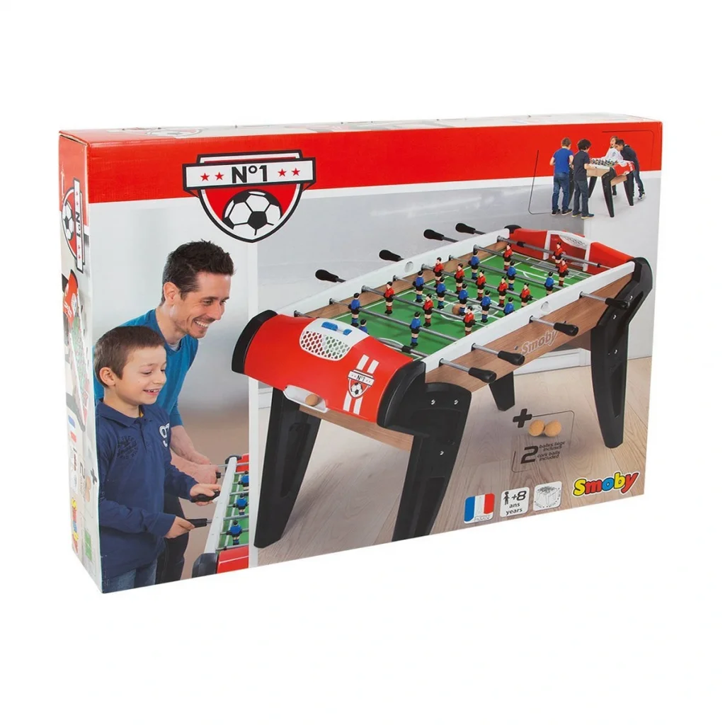 Oyun sahasında çimlerin dizilişi ve uygun işaretlemeler ile birlikte, top atışında 2 gol ve top yakalayıcı, 2 gol sayacı, oyuncu figürleri ve ergonomik kulplar ile sağlamlaştırılmış teleskopik oyun çubukları çok renkli bir şekilde ekiyor.