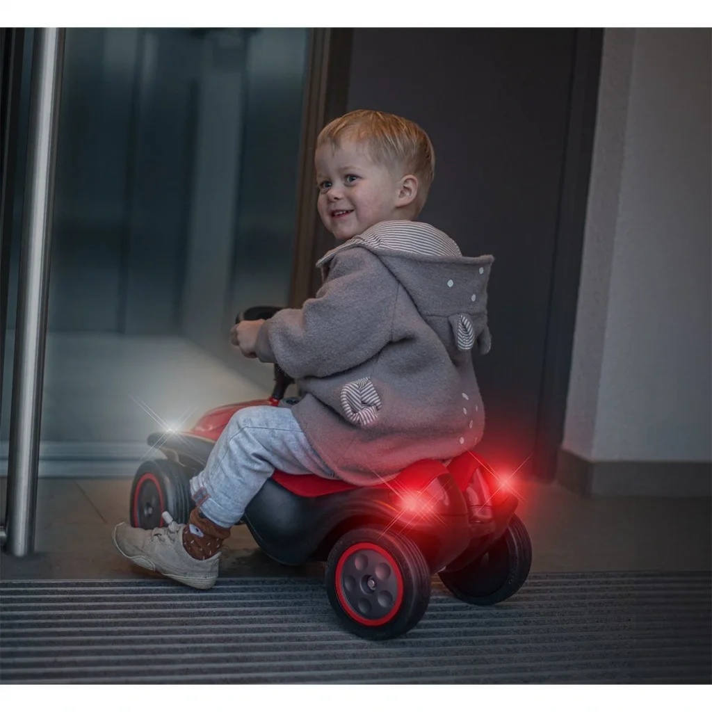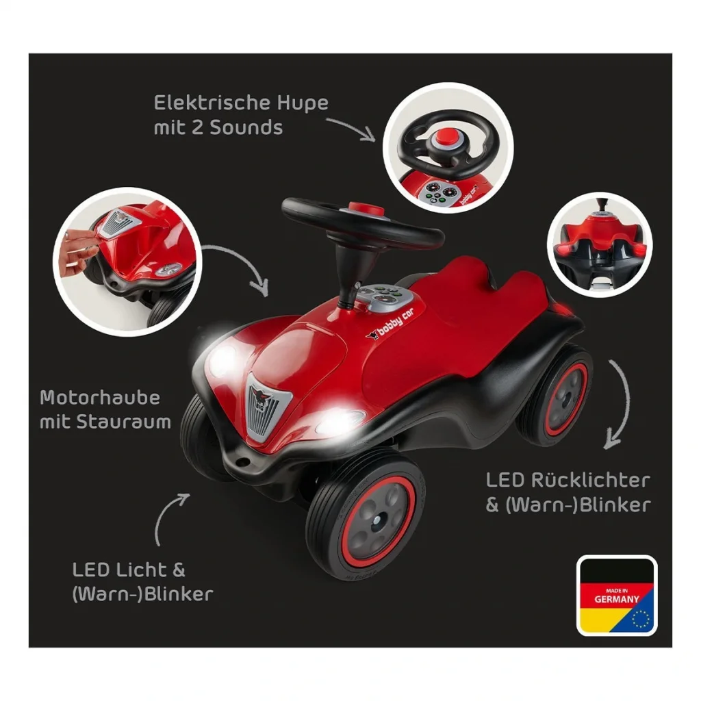 -Işık, sinyal lambaları ve tehlike lambaları dahil - LED teknolojili çift far (3x AA dahil) - Korna ve motor sesi olan elektrik modülü (2 x LR44 dahil) - Fısıltı tekerlekleri ve çıkarılabilir / yıkanabilir yumuşak koltuk - Almanya'da üretilmiştir -Oturma yüksekliği yaklaşık 19 cm