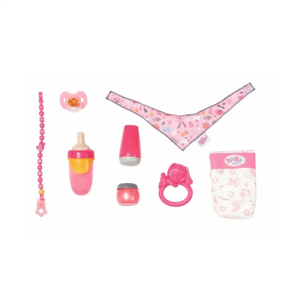 Baby Born bebeğini rahatlatmak için sihirli bir emzik ve önlüğü de set içerisinde bulunuyor. Son olarak bebeği eğlendirmek için bir çıngırak da sete dahildir. Bu aksesuar seti, üç yaş ve üzeri çocuklar için uygundur ve yaratıcı oyunlarla uzun süreli eğlence yaratmak üzere tasarlanmıştır.