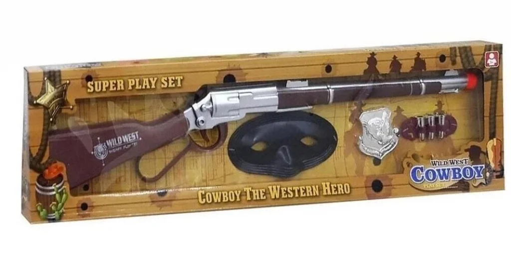 Rozet, mermi, maske, içeriği olan Oyuncak Kovboy Tüfek Set
