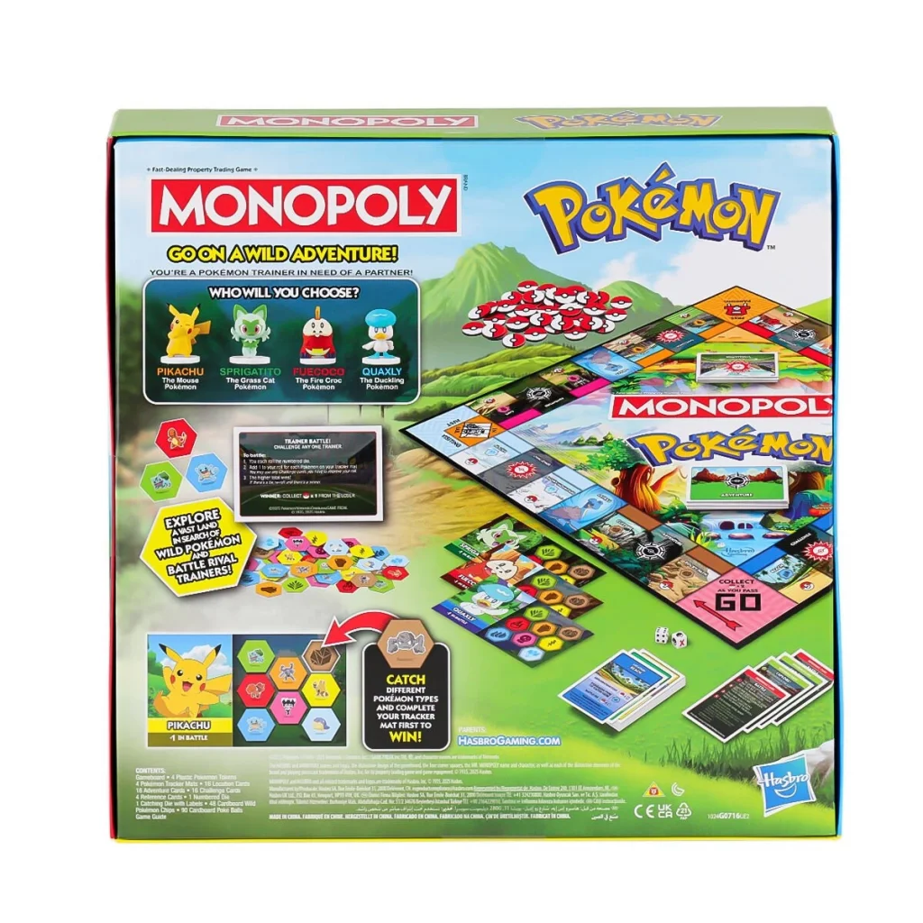 Pokemon evreninden esinlenen mekanlar ve karakterler içeren bu Monopoly Pokemon Sürümü oyununda aileniz ve arkadaşlarınızla heyecan verici bir Pokemon yakalama macerasına çıkın. Monopoly oyununun bu versiyonunda, Mülkler Pokemon için keşfedilecek mekanlardır ve Poke Topları Monopoly parasının yerini alır. Eğitmen olarak oynarken mekanları kontrol etmek ve keşfetmek için yarışın. Bir eş seçin! 4 sevimli plastik Pokemon jetonundan birini seçin: Sprigatito, Fuecoco, Quaxly ve Pikachu. Oyuncular 8 farklı türde Pokemon yakalamaya ve bunları takip matına eklemeye çalışır. Her türden bir tane toplayan ilk Eğitmen VEYA Poke Topları olan son eğitmen kazanır. Ormanlardan şehirlere ve spor salonlarına kadar konumların kontrolünü ele geçirin. Kontrol edilen bir konuma gelen bir oyuncu, o konumu keşfedebilir veya o bölgeyi ele geçirmek için sahibiyle savaşabilir. Bir Macera kartıyla, bir Eğitmen rakiplerinden konumlar edinebilir, Pokemon toplayabilir ve daha fazlasını yapabilir!