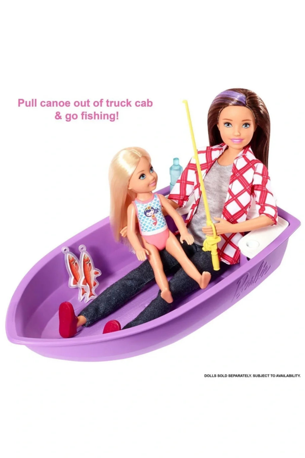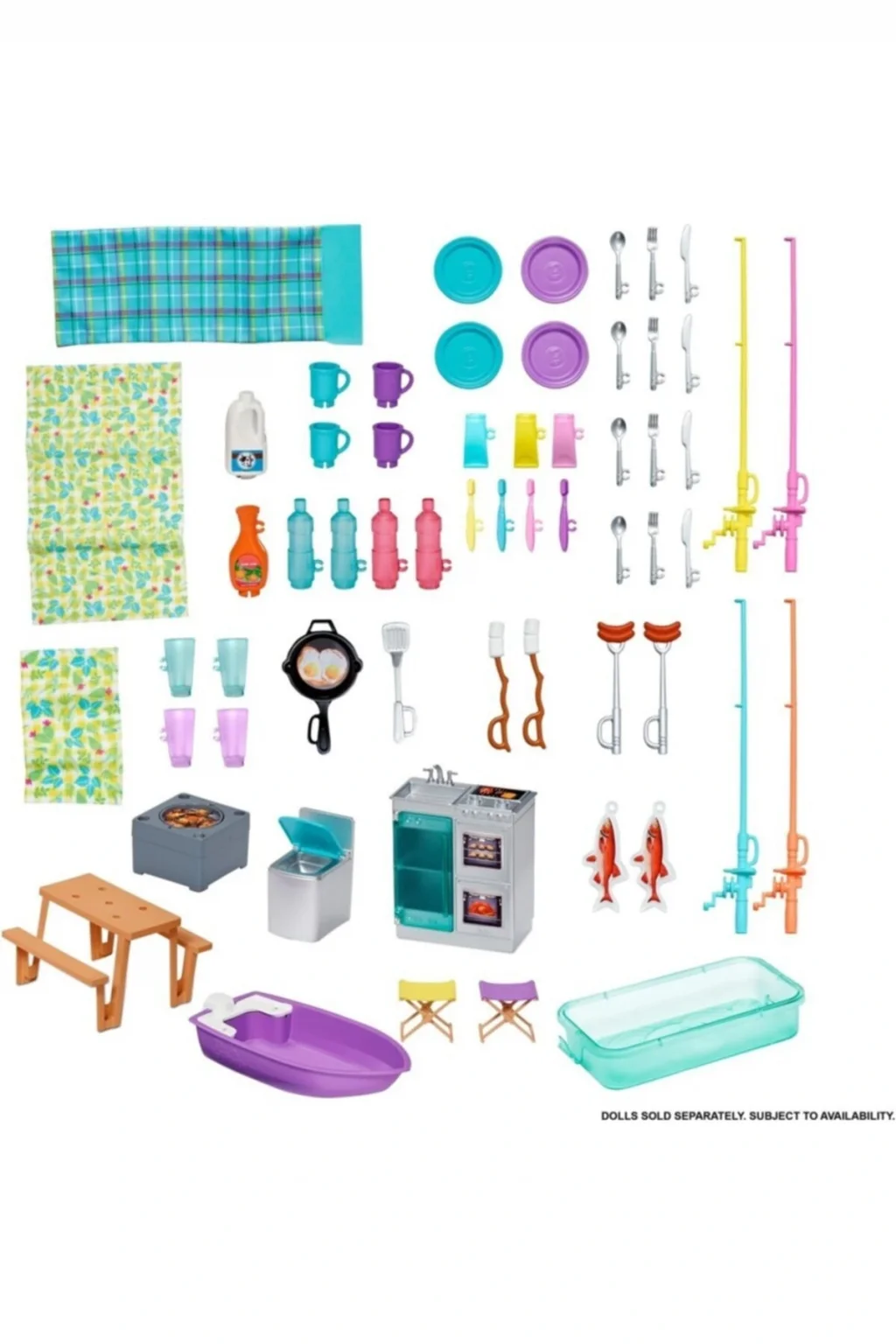 Set içerisinde Barbie® 3'ü 1 arada Rüya Karavanı™ aracı, 1 dönüştürülebilir kamyonet, 1 tekne, 4 tabak, 4 fincan, 4 çatal, 1 ıspatula, 1 tencere, süt, portakal suyu, 2 su şişesi, 2 s'more tatlısı, 2 sosisli sandviç, 1 balık, 4 diş fırçası, 1 diş fırçalık, 2 battaniye, 1 uyku tulumu, olta, 2 tabure, 1 dönüştürülebilir kamp ateşi ve 1 piknik masası bulunur.