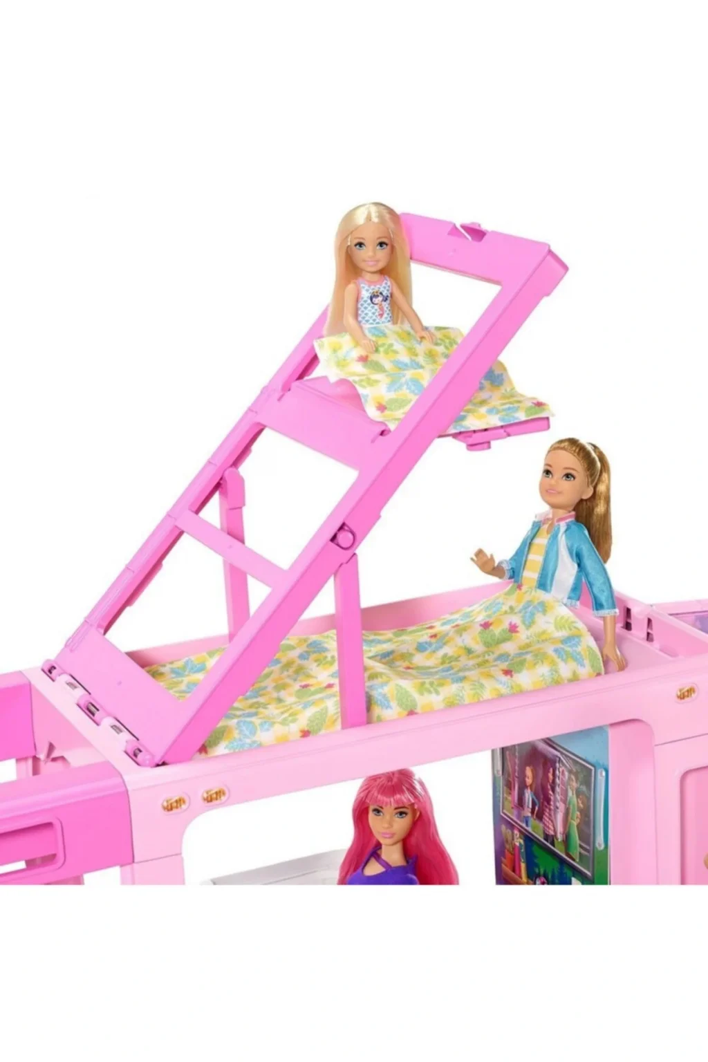 Kızlar Barbie®'nin 3'ü 1 arada Muhteşem Karavanı ile yola çıktıklarında, hayal güçlerinin onları götürdüğü her yere gidebilir. Birden çok dönüşüm imkanı ve saklı sürprizler oyun vaktini daha da eğlenceli kılar. Parlak pembe karavanda yapacakları ufak bir hareket yepyeni eğlence imkanları sunar. Keşfetme zamanı geldiğinde karavanın ön kısmının kilidini aç ve dört kişilik kamyoneti ortaya çıkar. Kamyonetin arka koltuğunun hemen altında, balığa çıkmak için ideal bir tekne bulunur! Kızlar kamp hayali kurduğunda yan panelleri açarak bu karavanı dört bebeğin yemek yiyebileceği, uyuyabileceği ve oyun oynayabileceği bir kamp setine dönüştürebilir. Bir taraf açıldığında bir havuz ortaya çıkar; diğer taraf açıldığında ise yemek pişirmek için ilham veren havalı, açık bir mutfak alanı oluşur. İkisinin arasında ise Barbie® bebeğin kendine has tarzını yansıtan resimlerle tamamlanmış, bebeğin kendini evinde hissetmesini sağlayan bir yaşam alanı bulunur. Son olarak, arka panel açıldığında portatif bir duş, tuvalet ve ayna ile karşılaşılır. Birden çok oyun alanı sayısız hikayeye ilham verecek. Keşiflerle ve oyunlarla dolu uzun bir günün ardından Barbie® ve kız kardeşlerini veya arkadaşlarını çatıya çıkarabilirsin. Buradaki açılır yatakta Chelsea™ veya diğer küçük bebekler yıldızların altında uyuyabilir. Bebekler bir sonraki maceraları için hazır olduğunda, her şeyi karavanın içinde toplayıp yeniden yollara düşebilirsin. Gerçekçi ayrıntılar ve havalı resimlerle oluşturulan eğlenceli tasarım yol gezilerini inanılmaz bir eğlenceye dönüştürüyor! 50 oyun parçasıyla sınırsız sayıda hikaye yaratabilirsin. Barbie®'nin Muhteşem Karavanı ile yolculuk hikayelerini canlandırmak ve açık hava maceraları yaşamak çok kolay çünkü Barbie® ile her şey mümkün! Barbie® dünyasını bebekler ve aksesuarlarla genişleterek oyun zamanını zenginleştirebilirsin (her biri ayrı olarak satılır ve stoklarla sınırlıdır). Bebekler ürüne dahil değildir. Renkler ve süslemeler çeşitlilik gösterebilir.