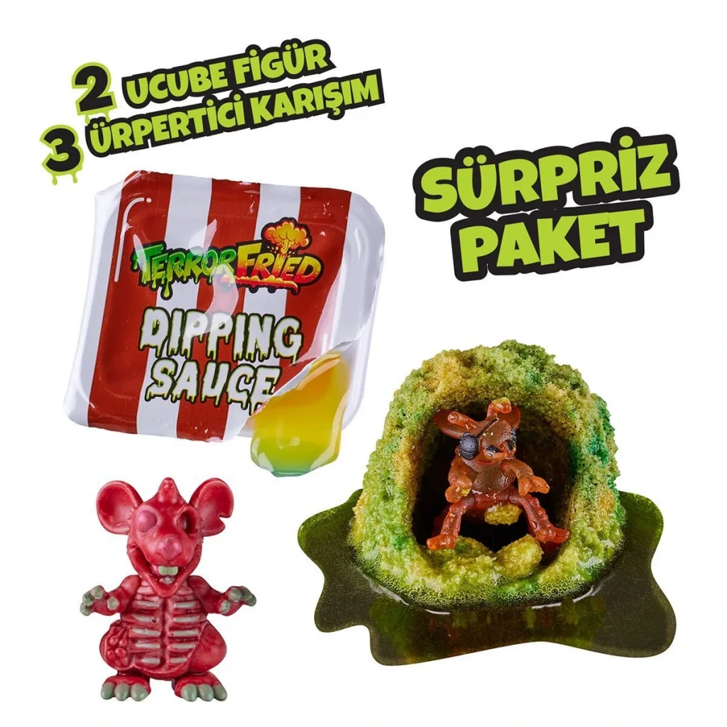 Her TerrorFried yemeği, bu yeni koleksiyonla oynarken köpürtebileceğiniz, ezebileceğiniz, çatlatabileceğiniz veya sızabileceğiniz ürkütücü bir duyusal bileşik içerir.