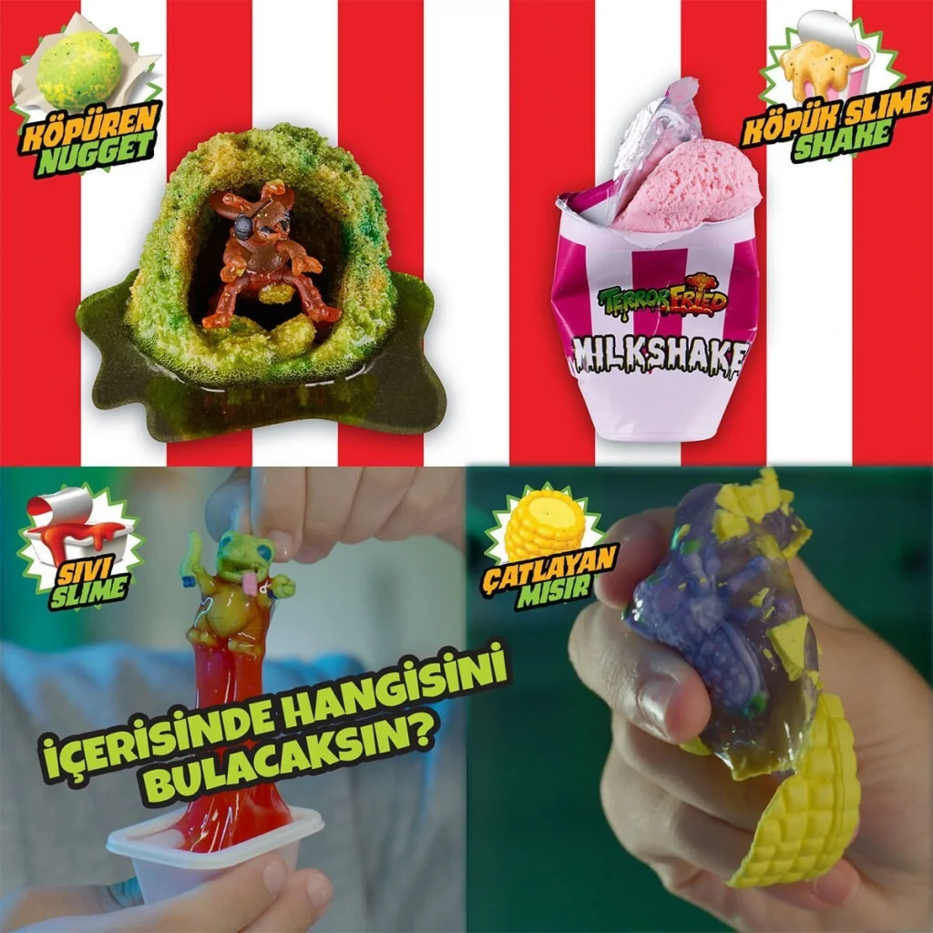 Korkunç bir sürpriz için yemeklerin içine gizlenmiş tuhaf figürleri keşfedin veya Smelly Slime sos poşeti ile duyularınızı test etmeye dalın.